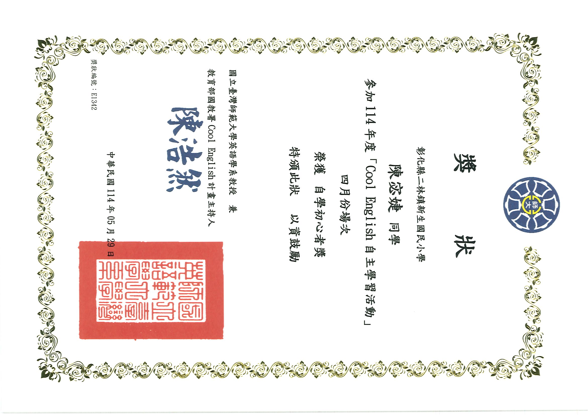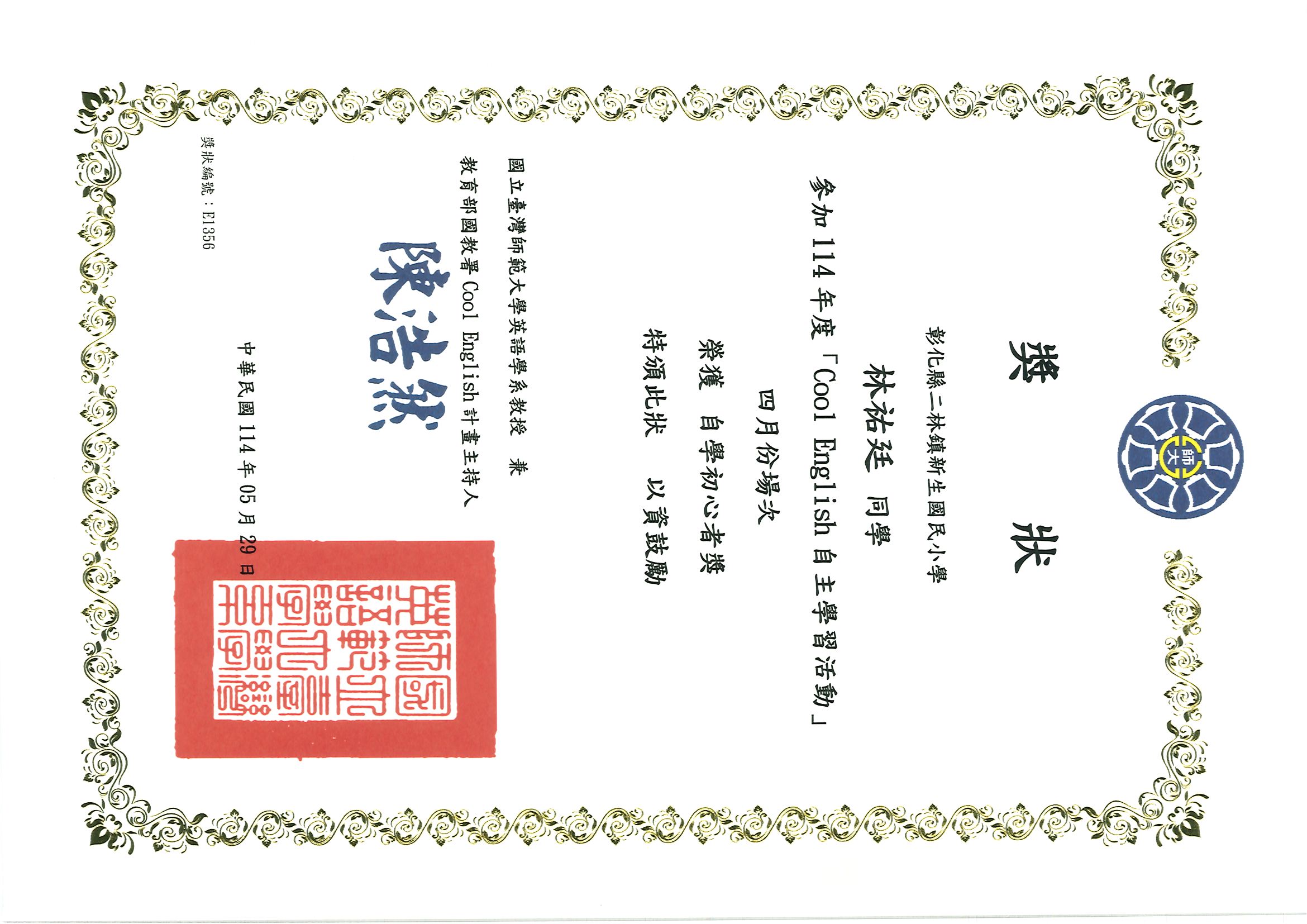 六甲 魏慈恩 六甲 林祐廷 榮獲114年度四月份「Cool English」自學初心獎 (曾欣瑀老師指導)